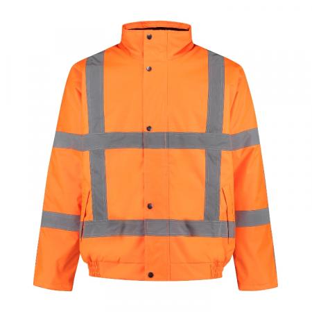 Pilotjack high visibility RWS, 100% Oxford polyester, 200 gram, PU coated, verdekte YKK ritssluiting met drukknoop, 2 voorzakken, binnenzak met klittenband, borstzak met ritssluiting, verdekte capuchon in de kraag, tricot manchetten, elastiek in de band.